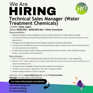 Interested candidates should send their CV to careers@hytng.com using “Technical Sales Manager as the subject of the email.